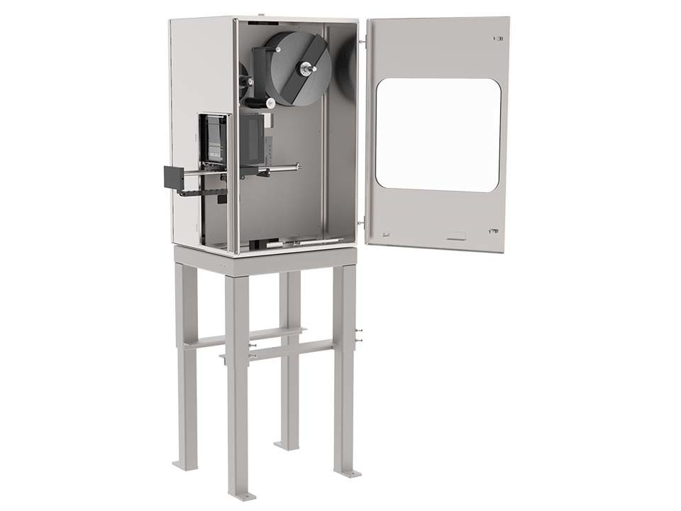 The enclosure has large doors to allow for access for label and ribbon replenishment as well as for routine cleaning and maintenance.